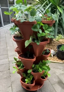 Starting from just $45, our free standing stacking planter kits are unique.  With 4 clovers and a center pole for added stability, choose between 3 colour options, 2 sizes and 3 planter sets including planters only, planters with trolleys, planters with trolley/growing medium/nutrient, raised strawberry towers and hanging vertical planters